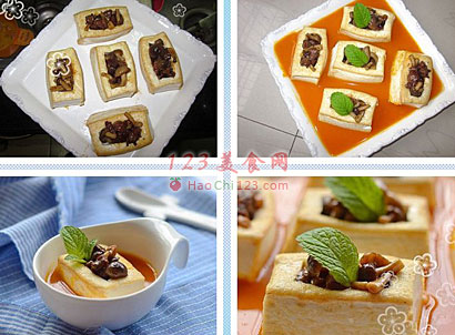8、将炒好的馅料装入在豆腐盒内,再在碟内倒入事先煮好的南瓜浓汁就大功告成了。