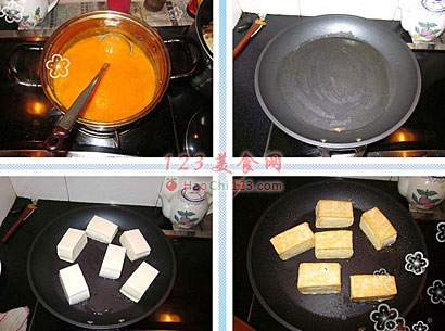 5、平底锅加入一点点的油,豆腐对半切开,放入锅内小火煎至六面金黄,取出用小刀在中间挖一个洞成豆腐盒,放进碟内备用。