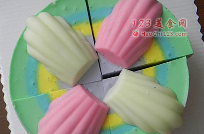 1、四色彩虹:6寸戚风片垫在模具底部,倒入绿色素+150克芝士糊急冻3-5分钟定型,再倒入蓝色素+130克芝士糊。依次将粉色素+130克芝士糊,黄色素+130克芝士糊倒入冷藏过夜后脱模,用贝壳巧克力装饰。