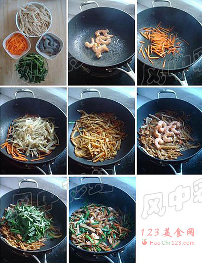 2、锅烧热倒油,下虾仁炒熟后盛出。