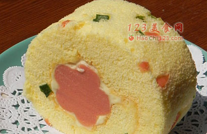 9、抹上沙拉酱,摆上花形香肠卷起,放入冰箱冷藏定型。