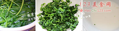 2、菠菜放凉手,用双手挤压出水分,然后切碎。