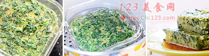 2、脱模时可用小刀辅助先沿容器四周划开,然后在鸡蛋菠菜酪上划一个“十”字,从中间底部铲起。