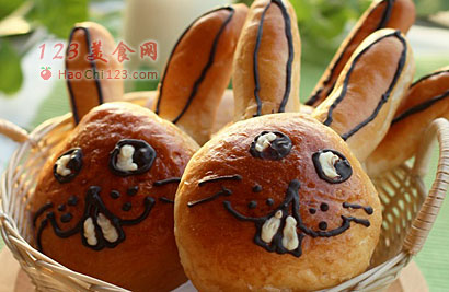 11、将裱花袋剪开一点,在冷却下来的面包上挤上兔子模样。