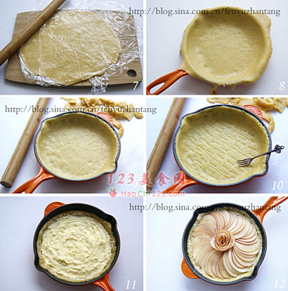 12、苹果片用厨房用纸吸擦干水份,表面均匀的围圈铺上一层苹果片,中间放入苹果花(苹果花做法见这里,我这里的做法圈苹果花没放面条来圈,由于有派馅,苹果花容易定型)。