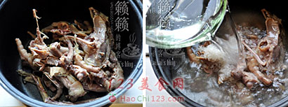 7、鸡肉撕下后,剩下的鸡架也别浪费了,将鸡架放入电饭煲中。