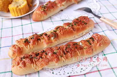 10、放入预热好180°的烤箱,烘烤约15分钟,中途撒干葱(如果是买来现成的干葱,出炉后撒),面包表面的芝士融化呈金黄色即可出炉。