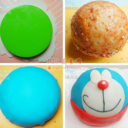 12、将蓝色翻糖皮盖在蛋糕上,边缘小心的用手帮忙粘合住。