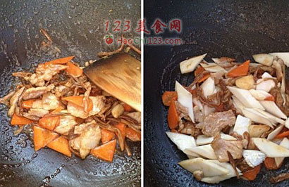 5、锅内再加油,放入姜、葱、蒜爆香后将肉片炒熟,然后依次放入胡萝卜、山药、木耳炒至7成熟。
