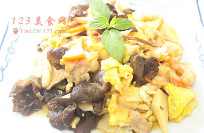 3、取空碗打两个鸡蛋,锅内加油,油温9成热后将鸡蛋入锅炒至7成熟。