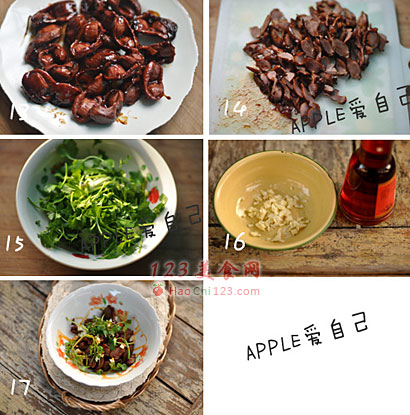 16、17、鸡胗切片,蒜瓣剁碎,香菜段放入,倒辣椒油拌匀就可以吃啦!
