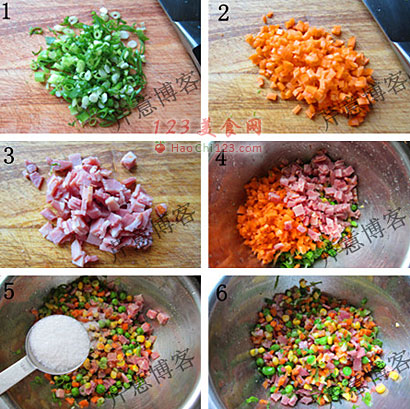 4、将香葱粒、胡萝卜粒、培根粒、玉米粒和青豆粒一起放进大碗。