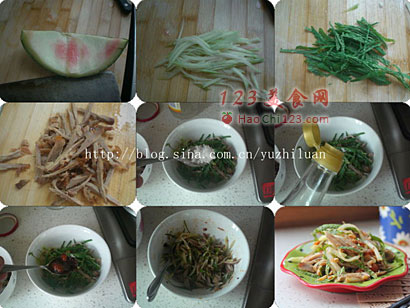 4、将西瓜皮丝,薄荷丝,烤鸭丝放碗中。