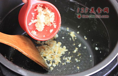 2、电饭煲烧热,倒入少许油,倒入一半的蒜蓉,炒至金黄,然后倒入另外一半蒜蓉略炒香,撒入一点点盐。