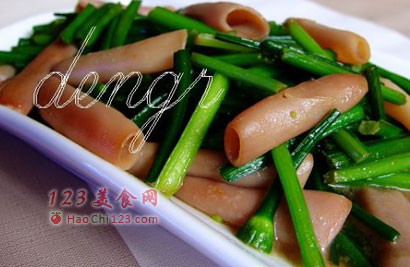 3、用海肠配以头刀韭菜制作的“韭菜海肠”是胶东名菜,此外“干海肠”、“氽海肠汤”、“肉末海肠”等都是很有地方特色的菜肴。鲜海肠还可调制水饺、包子馅等。尤其“韭菜炒海肠”,韭菜籽和海肠含有人体所需VE等多种微量元素。VE被称为生育维生素,海肠在胶东渔民中又称“海鸡子”。这两种菜配合在一起,就成了一道特别适合男士的菜,具有温补肝肾、壮阳固精的作用。[LaoYanHuo.com]