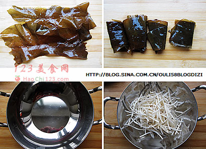 3、豆芽择去两头,金针菇切掉根部、香菇和油菜切去根蒂,分别清洗干净,泡发的海带清洗干净切成条,然后卷成海带卷(省事的也可以切成片)。