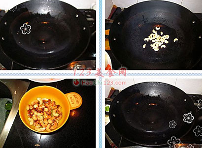 2、炸腰果时一定要小火小心炸,我一走开一下,有一边炸的太焦了一点啦。