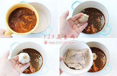 3、煮开后加入酱油、蚝油、干红辣椒,根据口味调入盐巴,小火卤3小时后关火,放入冷藏室浸泡24小时。食用前加热并改刀淋上卤汁即可。