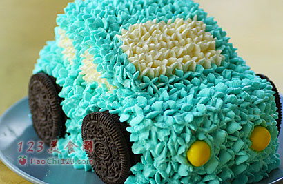 7、8、白色奶油调入少许蓝色色素,再装入裱花装用小号菊花嘴挤满整个车身,最后将两粒黄色巧克力豆放在车头前即为车灯。