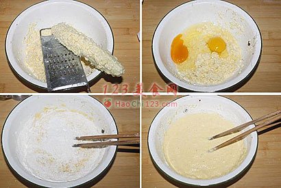 3、将面粉放入玉米浆中拌匀成稍具流动性的面糊,可以用水来调节浓稠度。