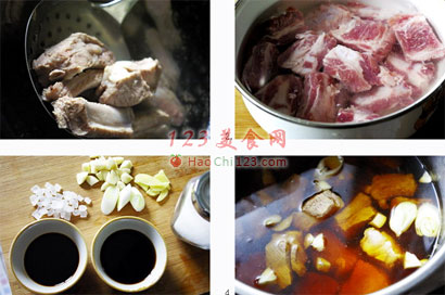 3、取一汤锅,将炒好的排骨,葱姜蒜一起放入锅里,注入没过排骨的水,调入生抽、老抽和黄酒,大火烧沸后,转小火,煮30分钟。