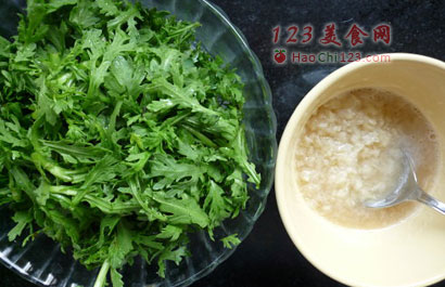 3、茼蒿洗净切成段,蒜泥放入碗里用盐、醋、鸡精调配,超简单。这菜啥时候吃,啥时候再用蒜泥汁调在一起。早了,茼蒿很娇嫩会焉。