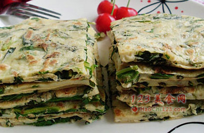 5、等面糊表面凝固后,翻面,烙至两面金黄即可。