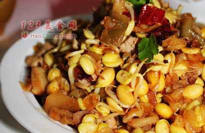 4、下黄豆芽和干辣椒继续煸炒,炒到没有生豆芽味,煸干水汽为止。