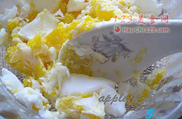 5、咸鸭蛋煮好浸冷水里,剥去蛋壳,放在碗里,用汤匙碾碎。