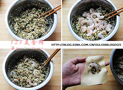 4、肉馅里加入剁碎的葱姜、荠菜末和白菜末,最后加入虾仁搅拌均匀,即成馄饨馅。