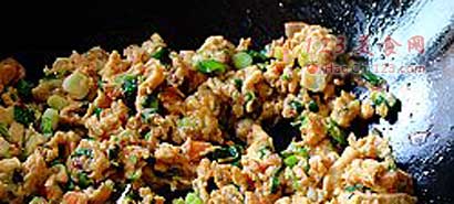 2、起油锅,油热后,把搅拌均匀的虾酱鸡蛋液倒入锅内炒制。