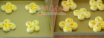 10、发好的面包表面刷全蛋液,中间撒少许白芝麻,放入预热好180度的烤箱中层,烤15分钟左右。