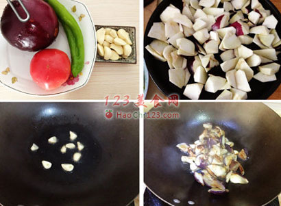 3、把切好的茄子用一半的蒜片煸炒出香味后。