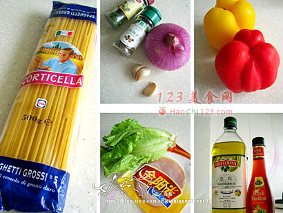 6、意面煮好后迅速过冷开水中,充分沥干水后,倒入味汁和处理好的食材拌匀即可。