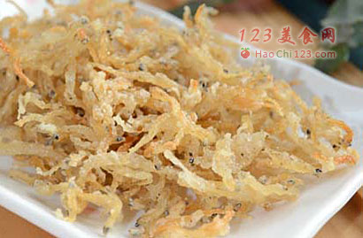 贴士:1、温油下入银鱼干,用小火慢煸,这样银鱼易脆不易糊。
