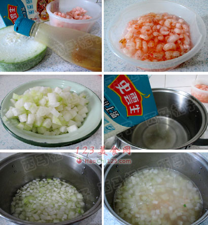 6、大火煮开,转小火煮至冬瓜丁软烂后加入沥干水分的虾仁。