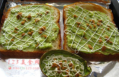 5、最后在牛油果泥上面挤上沙拉酱。