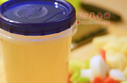 3、将汤滤干净保存起来,即是自制的美味蔬菜高汤。