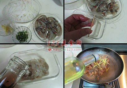 3、用虾油煸炒虾仁,虾仁变色后再下入萝卜丝一起翻炒。