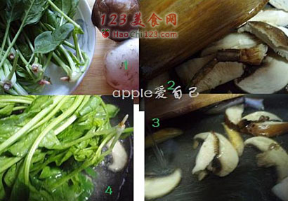 2、菠菜不用切,将蘑菇、香菇切片,锅里倒上油,烧热后,倒入蘑菇、香菇,炒香。