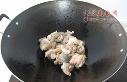 4、油热后放姜片进去爆香;再放入焯过水的羊腿肉进去炒下。