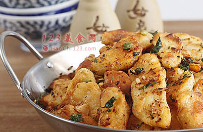 4、将所有煎好的土豆片都倒入锅中,放入葱姜蒜末和辣椒粉、孜然粉、花椒粉、一小勺盐开中火不停地翻炒,直到所有调料的香味都散发出来;喜欢味精和鸡精的也可以放一些;当然不嫌麻烦的先用油炒香葱姜蒜末和调料,再倒入土豆片翻炒这样更入味。