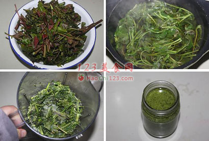 4、打好的香椿泥尝一下,再用盐调一下味道,要比平时炒菜咸一些,然后放入干净无水的玻璃瓶中,在上面再倒上一层油,起密封的作用,能让香椿酱放得久一些,做好的香椿酱盖上盖子放入冰箱冷藏保存,一两个月是没有问题的,吃的时候用勺子将油往旁边倾斜一下,用勺子挖出来一些,再平放瓶子油就又盖上香椿酱了。