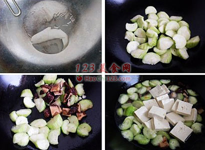 3、放丝瓜块,煸炒,再放香菇块,翻炒。