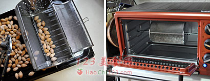 5、将烤笼取出,观察一下白果的熟度及上色情况,将烤箱温度上调至180℃,追加烘烤10分钟左右,使其更加酥香并上色理想。