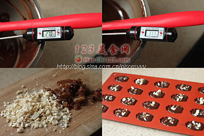 7、把巧克力装入裱花袋中,挤入模子中,撒入杏仁碎及提子丁。