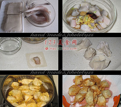 1、龙头鱼不要切得太大块了,要以云吞皮可以完整包裹为准,也是保证炸的时候,云吞皮和龙头鱼的成熟度是一样的。