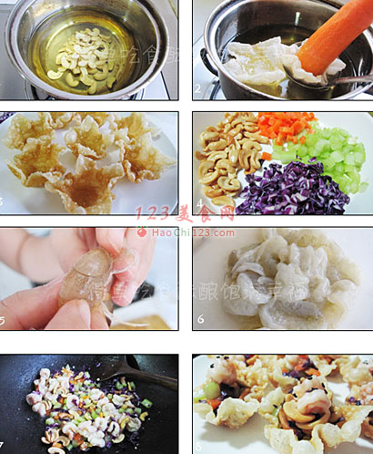 7、炒锅里倒入少许食用油,加蒜蓉炒香,倒入虾仁炒成虾球,再倒入腰果和蔬菜丁翻炒2分钟,出锅前加盐和蚝油入味。
