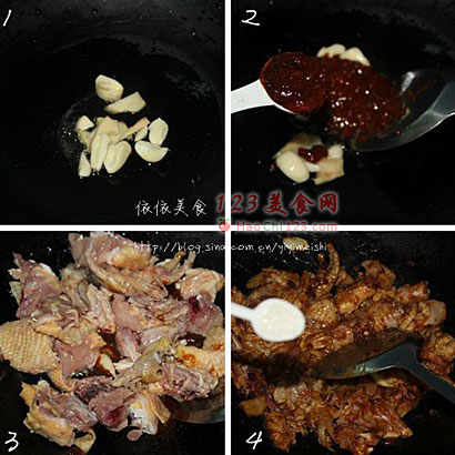 4、加一点点白糖,把鸡块和黄豆酱翻炒均匀。