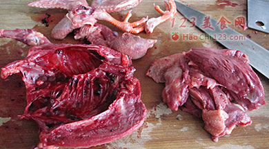 2、因为乳鸽宰杀比较麻烦,所以最好请店家代为宰杀,回到家后,用剔骨刀把鸽肉分离出来,这道菜里只用到鸽肉,鸽骨架可以加几根排骨一起炖汤哈。